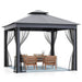 Our 296 x 296 cm patio gazebo provides a 9 m2 large footprint, which is ideal for enjoying outdoor entertainment with your family and friends. For simplifying the installation process, this tent boasts thumb screws to secure the frame for tool-free assembly, while pop up adjusters at the corners to ensure the canopy fabric remains taut and neat. For enhanced comfort, it is equipped with detachable mesh netting that maintains good ventilation while blocking “unwelcome guests”. And it adopts a double-roof polyester canopy enhances ventilation while providing exceptional protection against outdoor elements (Note: Please detach the canopy in severe weather to prolong its service life). We also provide 8 metal stakes to secure 4 ground plates, also secured by expansion screws (not included) for hard grounds. This versatile gazebo is perfect for various outdoor activities like garden parties, barbecues, picnics, or events, elevating your outdoor leisure time! Bullet Points:Upgraded Structure for Easy Installation: This 296 x 296 cm patio gazebo boasts convenient thumb screws to secure the frame, no tools required. The canopy is easily attachable to the frame with hook and loop fasteners, and innovative pop up adjusters at 4 corners allow for quick tightening and precise installation. Reliable Construction: Crafted from a premium polyester canopy with PU 1000 mm waterproof rating, the outdoor shelter offers superior sun protection and fade resistance while capable of handling light rain. And there are water leakage holes to prevent water accumulation on the roof. Note: Please detach the canopy in severe weather to prolong its service life. Double Roof Design with Netting: This tent is equipped with a double-roof canopy, which not only reduces wind pressure to maintain stability but also promotes ventilation, ensuring a comfy environment underneath. Furthermore, there is netting in the roof, keeping “unwanted guests” away. Breathable Mesh Netting: The patio pavilion comes with all-around mesh netting, allowing you to enjoy fresh air and privacy while keeping “unwelcome guests” at bay. And each side features a convenient double-sided zipper for easy access. The netting is securely fastened with hanging loops for hassle-free removal when needed. Sturdy and Stable Design: Featuring anchored plates with pre-drilled holes, accompanied by 8 ground stakes, the gazebo can be securely fixed to soft surfaces. Optional expansion screws (not included) are also available for installation on hard surfaces, ensuring your structure remains safe and stable even in varied environments.