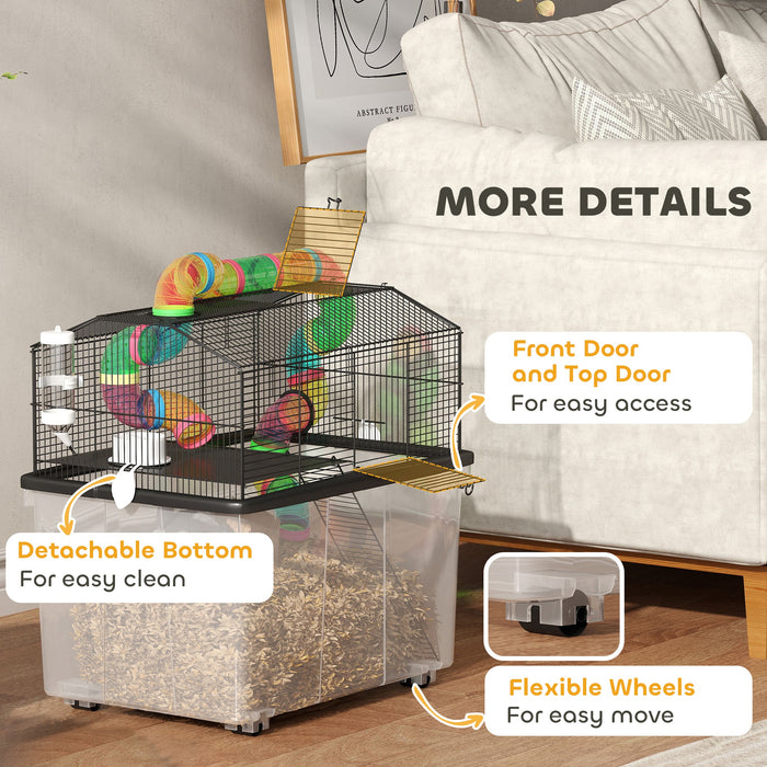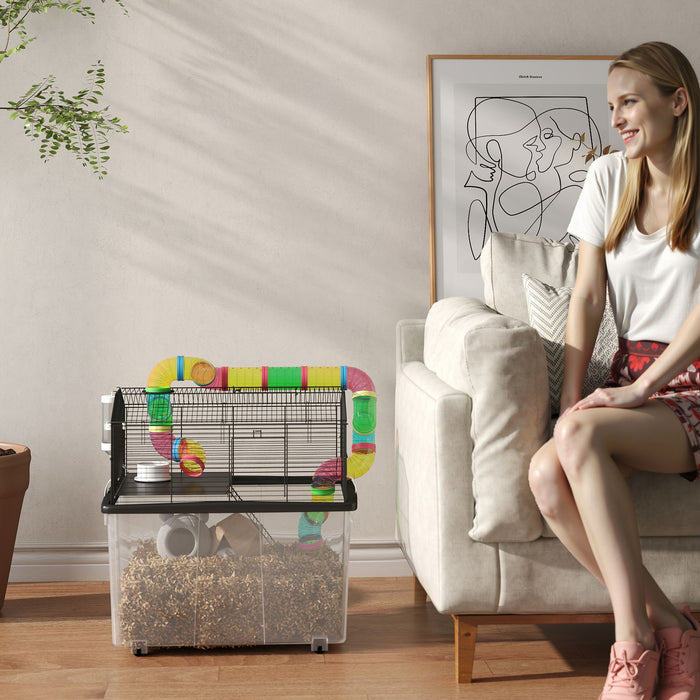 Discover the PawHut Hamster Cage, a spacious 2-tier world with a vibrant tube system for endless exploration. This large hamster cage features a 31cm deep tray ensuring a playful, yet tidy habitat. It comes with all the essentials: perch, ramp, water bottle and food dish, making it a delightful haven for any dwarf hamster or gerbil. Plus, it's easy to move with handy bottom wheels!