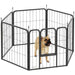 Discover your furry friend's kingdom with the PawHut Dog Playpen! It can transform into various shapes like a square, rectangle, or L-shape to fit your space and pet's needs. This indoor dog pen not only keeps your pet secure with a convenient door but also folds easily for storage. Made from robust steel and anchored with 6 ground stakes, it's great for both indoor and outdoor setups.