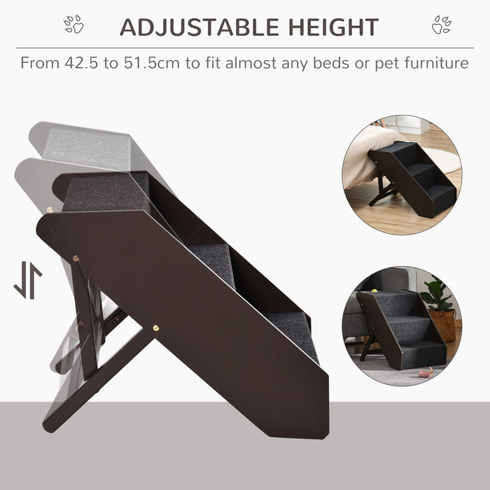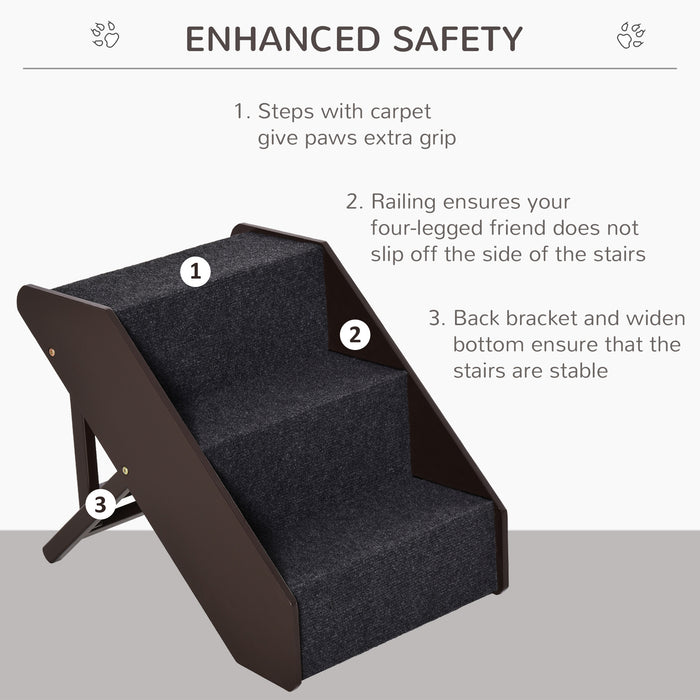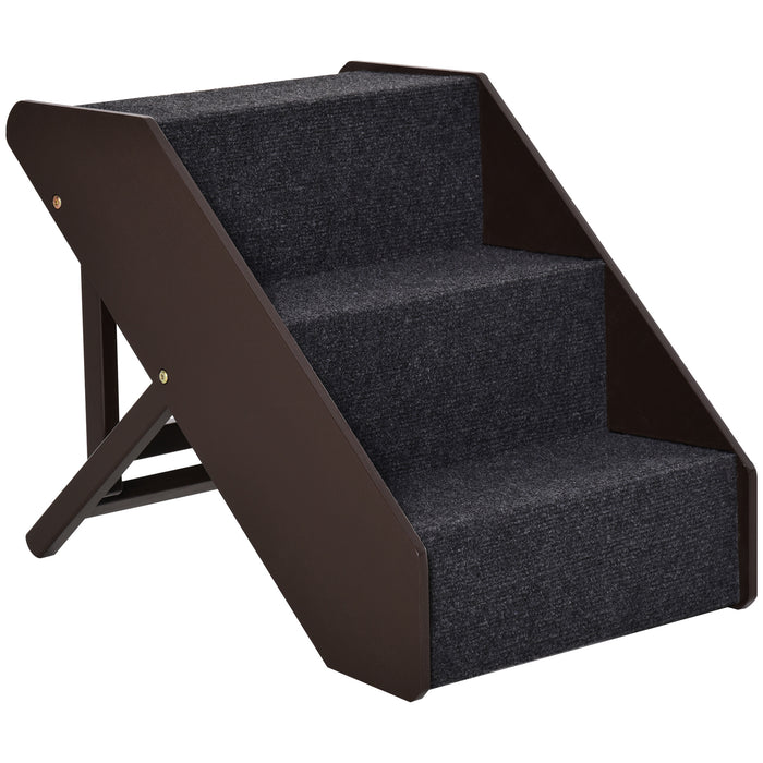 Made from high-quality MDF and finished in a classic dark brown, the pet stairs complement any room they are placed in. With dimensions of 40.8W x 56.5L x 42.5-51.5H cm, they are the perfect size for most household needs. Each step measures 38.5L x 16.5W x 15.5H cm, offering a wide and comfortable platform for your pet. The product requires simple assembly, ensuring that your pet can start enjoying their new climbing aid in no time.