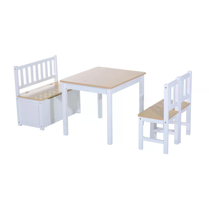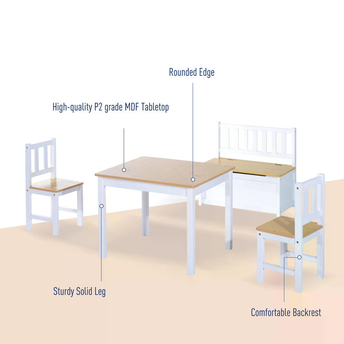 The thoughtfully crafted ensemble comes with a quartet of pieces: a lovely table, a cleverly designed storage bench, and two elegant high-back chairs. The bench boasts a seat that lifts to reveal a hidden compartment; a no-fuss, U-shaped cutout serves as an intuitive handle for easy access. This nifty storage space becomes home to your child's cherished toys, favorite storybooks, or craft supplies, keeping the play area tidy and organized.
