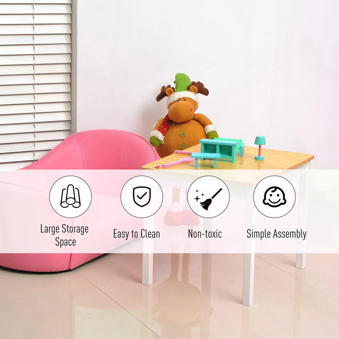 Whether nestled in a corner of your child's bedroom, claiming a spot in the playroom, or gracing your living room, this furniture set blends in with its understated color palette of natural wood and white finishes. The table and seating options present the perfect multipurpose area for various activities—from drawing and craft-making to completing homework and enjoying meals.