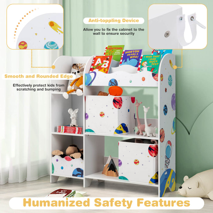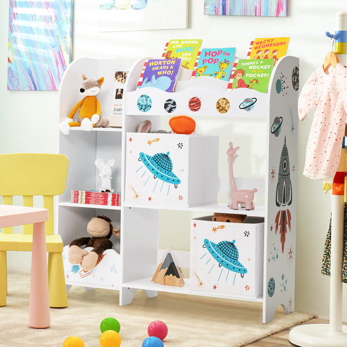 The thoughtfully compartmentalized design includes 2 removable cloth drawers, 3 slots perfect for books, and 5 additional compartments ready for an array of items. This flexible storage solution promotes categorization skills, inviting children to organize personal items such as toys, apparel, and reading material.
