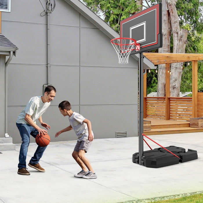 Elevate your driveway tourney with our portable basketball hoop! Featuring 6 rim heights adjustable from 7.5 ft/230 cm to the standard 10 ft/305 cm, our basketball system can be easily tailored to suit both novice and expert players. Its robust 44-inch backboard offers excellent rebound and longevity, and is attached with a regulation-size rim for serious play. Its base, built from quality HDPE, can be weighed down with up to 220 lbs/100 kg of sand or 165 lbs/75 kg of water, ensuring rock-solid stability during energetic play sessions, while ease of movement is assured with two integrated wheels. Perfect as a growth-inspiring gift, our basketball system encourages active play across all ages! Bullet Point:Play Like a Pro: With a max height of 10 ft/305 cm and a standard 18-inch rim, our portable basketball hoop elevates your backyard games to pro levels. Its shatterproof 44" backboard is reinforced with corner protections and a Y-shaped metal bracket at its back, encouraging dynamic play.Adjustable Height: Our outdoor basketball hoop offers 6 rim heights from 7.5-10 ft/230-305 cm, adjustable in 0.5 ft/15 cm increments to suit players of different age groups and skill levels. A user-friendly rotary knob facilitates quick height changes, without requiring any tools.Enhanced Stability: Anchored by 2 triangular beams to a thick post, the heavy-duty HDPE base of the hoop system provides optimal stability for intense games. It is fillable with 165 lbs/75 kg of water or 220 lbs/100kg of sand (recommended). You can also add extra weight by placing heavy objects on its top.Effortless Mobility: Featuring 2 smooth wheels, our portable basketball hoop is easy to relocate across different surfaces. Designed for year-round play, it can be set up in your yard or driveway during fair weather, and effortlessly moved inside for storage or indoor games.Perfect Gift: The basketball hoop makes an ideal gift for your loved ones, perfect for adding delight to birthdays or Christmas. Suitable for kids, teens, and adults, it provides a healthy alternative to electronic gadgets, fostering family bonding and physical wellness.