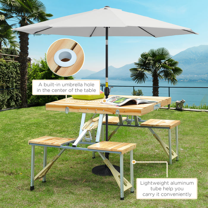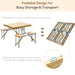 Our space-saving design takes the burden out of transportation. The compact fold transforms this ensemble into the size of a suitcase, featuring a sturdy handle for ultimate portability. Relish the convenience of a picnic table that accompanies you with effortless grace to any location.