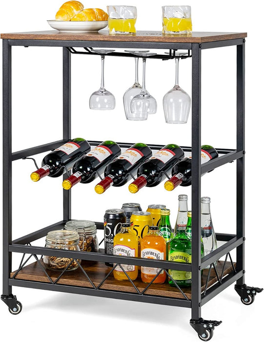 An integrated wine rack cradles up to 5 standard-sized bottles, ensuring your favorite vintages are always within reach. Additionally, this kitchen trolley boasts dual glass racks, capable of housing approximately 4 elegant goblets, perfect for entertaining guests or for a simple, sophisticated dinner.