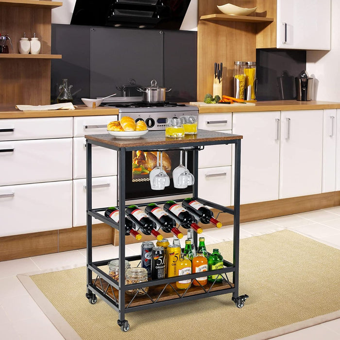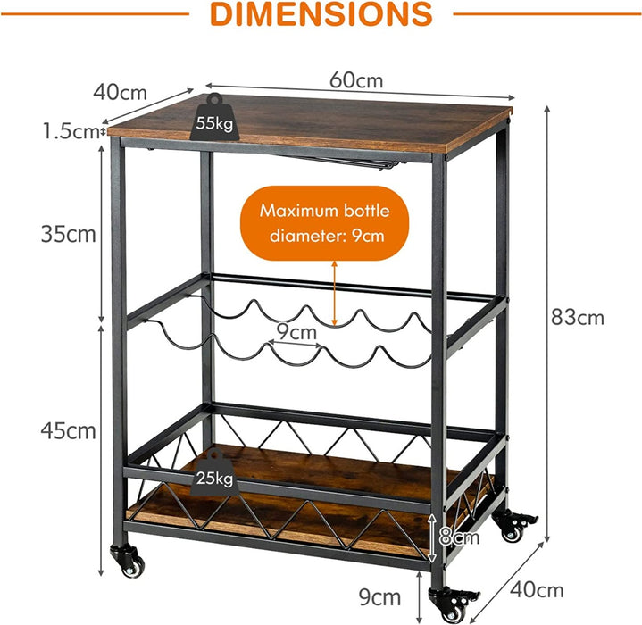 Invite efficiency into your kitchen space with this elegantly crafted portable kitchen trolley. Embrace a tidy workspace, indulgent wine storage, and versatile shelving, all brought together in one sophisticated package. Make this kitchen cart yours and revel in the beauty and convenience it brings to your home.