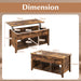 Colour: Brown/White/Coffee/Black Material: Engineered Wood Overall Dimension (Top Not Lifted): 105 x 52 x 49 cm (L x W x H) Size of Hidden Compartment: 93 x 45 x 15 cm (L x W x H) Size of Each Open Cube: 30 x 48 x 24 cm (L x W x H) Height of Lifted Top: 63 cm Height off the Ground: 6 cm Load Capacity of Top (Lifted): 30 kg Load Capacity of Top (Not Lifted): 95 kg Load Capacity of Hidden Compartment: 50 kg Load Capacity of Each Open Cube: 15 kg Net Weight: 27.5 kg Package Includes: 1 x Coffee Table 1 x Instruction Manual