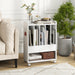 The trendy record player stand not only showcases your precious albums with 4 sleek dividers but also whispers convenience into your life through its robust organization and storage options. Imagine settling your favorite items on a spacious tabletop, tucking away your little essentials in a nifty drawer, and maximizing every space with additional hooks and shelf. Yet, it's so much more! Thrill in the ease of gliding from room to room with its smooth-rolling casters, or securely lock it into place. Versatile? Absolutely! Use it as a chic end table or a handy printer stand. Transform your room's vibe instantaneously! Clear Record Organization: The record player stand features 4 record dividers, providing a neat and accessible display for your vinyl collection. The display shelf is 34 cm tall, holding a large number of albums in an organized way. Spacious Storage Solutions: Enjoy ample storage with this multifunctional storage organizer! It has a spacious tabletop for everyday items, a storage drawer for small accessories, a bottom shelf for additional storage, and a hanging hook for hanging headphones or other accessories. Easy Mobility: Equipped with 4 universal casters, including 2 lockable ones, the mobile turntable stand boasts effortless movement and stability when needed. It is a breeze for you to move it from one room to another, finding an ideal spot to enjoy the melody. User-friendly Design: The vinyl record cabinet's side hook can be installed on either side for flexibility. And its tabletop includes guardrails to prevent items from falling off. What's more, the round corner design can protect you from bumps or scratches. Multi-Functional Utility: Versatile in use, this stand serves not just as a record player stand, but can also function as an end table or even a printer stand. This versatile unit is a practical addition to any room!