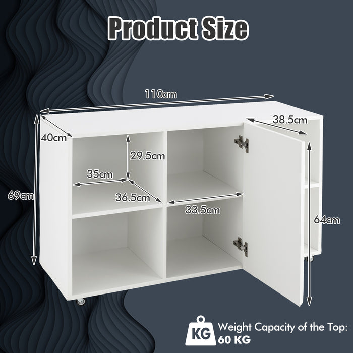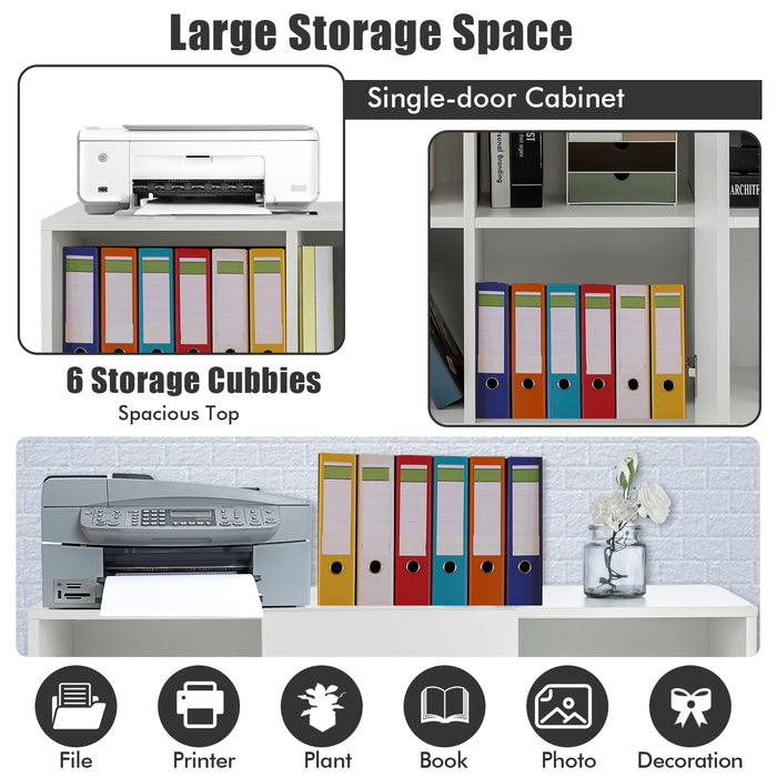 Our exquisite cabinet features an expansive tabletop surface, ideal for housing printers, decorative items, or other frequently accessed objects. The heart of this unit lies in its generous storage capacity, including an enclosed cabinet and four spacious open compartments equipped with adjustable shelving. Each shelf is poised to cradle your belongings securely, providing an organized sanctuary for your varied storage needs.