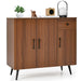 The sideboard has 1 wide cabinet top, 1 double-door cabinet, 1 single-door cabinet, and 1 drawer to keep your items well organized. 5-position adjustable shelves make it suitable for items of different sizes. It will be a wonderful addition to your kitchen, dining room, living room, and more. 3 doors with handles are easy to open. The soft close hinges help you safely open or close the doors. Moreover, the solid metal legs and anti-toppling devices keep the cabinet steady and not easy to wobble. Abundant Storage Space: The spacious cabinet top provides sufficient space for you to display your ornaments. The sideboard also features 1 slide-out drawer, 1 double-door cabinet with shelf, and 1 single-door cabinet with shelf, allowing you to store a variety of items. 5-Level Adjustable Shelves: The adjustable shelves behind the door offer customized interior space for you to place things of different heights. Each shelf can be adjusted to 5 positions, and the distance between each level is 3.5 cm. Solid and Sturdy Structure: Supported by heavy-duty metal legs, the buffet cabinet keeps stable and steady. Anti-toppling devices ensure added sturdiness and avoid wobbling. More Safety and Convenience: Soft close hinges ensure slow opening and safe closing. Additionally, the smooth metal slides and handy drawer knob help you easily open the drawer to reach for what you need. Stylish Look and Versatile Uses: With exquisite wood grain and sleek lines, the coffee bar cabinet seamlessly blends with various decorations. It can be used in the kitchen, dining room, living room, hallway, and more.