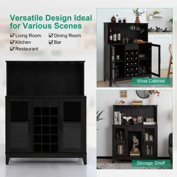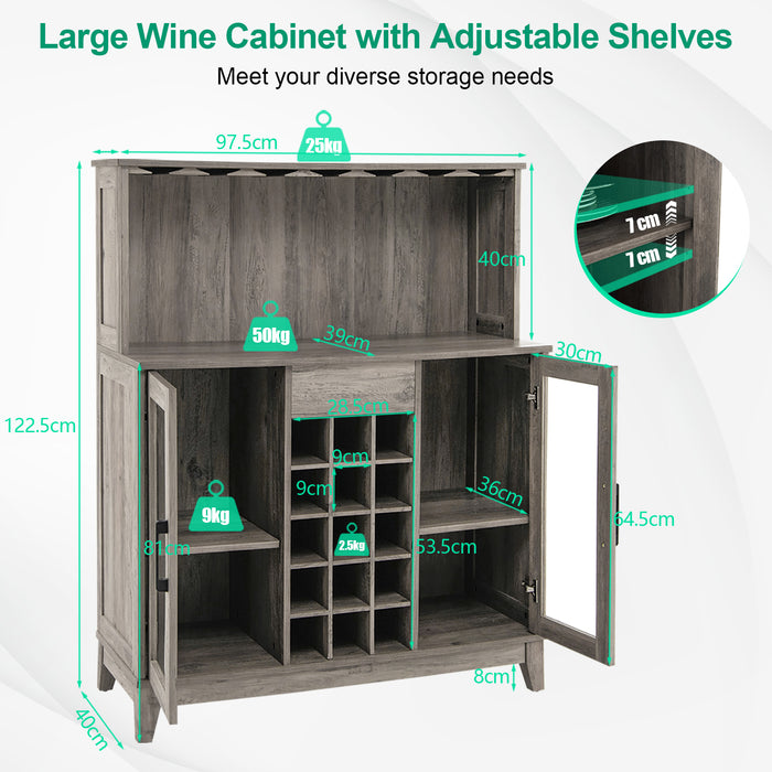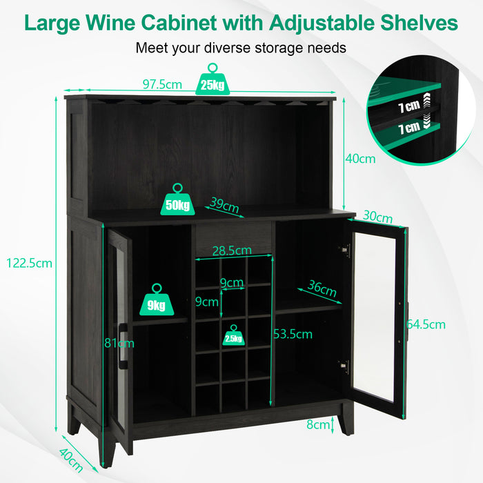 Introducing a harmonious blend of functionality and allure, this sleek sideboard is the epitome of contemporary grace in home storage solutions. An essential for any connoisseur of fine wines, the sideboard seamlessly integrates a 15-slot wine rack with dedicated holders for your cherished stemware. Beyond its appeal to oenophiles, the design offers generous space for an array of items within its top shelving, expansive countertop, and duo of cabinets featuring adjustable shelves to suit your storage needs.