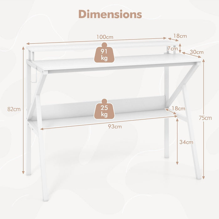 Colour: White Material: Engineered Wood, Metal Overall Dimensions: 100 x 48 x 82 cm (L x W x H) Dimensions of Monitor Shelf: 100 x 18 cm x 7 cm (L x W x H) Dimensions of Tabletop: 100 x 30 x 75 cm (L x W) Dimensions of Bottom Shelf: 93 x 18 x 34 cm (L x W) Weight Capacity of Tabletop: 91 kg Weight Capacity of Shelf: 25 kg Weight Capacity of Monitor Shelf: 20 kg Net Weight: 12 kg Box QTY: 1(May vary by batch) Package Includes: 1 x Small Computer Desk 1 x Instruction Manual