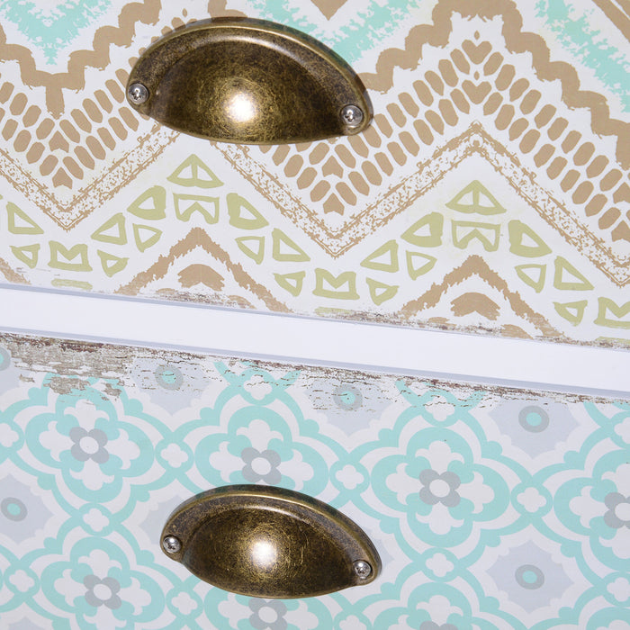 Each of the five drawers showcases a unique theme and pattern, harmonizing to present a cohesive yet eclectic appearance. The rustic, weathered edges evoke an antique aesthetic, making it a focal point of any room. Its versatile stature allows it to fit comfortably as a bedside table, an accent next to your sofa, or a welcoming storage piece in your entryway.