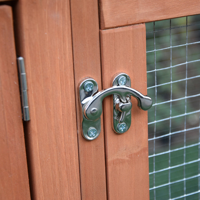 Attentive to both pet and owner's needs, the habitat includes smart features. An interior ramp allows your pets to move easily between their living quarters and the play area. The secure, lockable doors ensure they remain safely inside while also letting you control their access as desired. The addition of a feeding trough inside the living quarters and a mesh window for close monitoring symbolizes our commitment to convenience and the loving care of your pets.