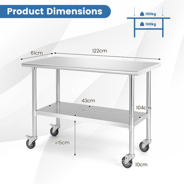 Our work table is crafted from superior stainless steel known for its strength and resistance to rust, ensuring that you have a heavy-duty surface that can cope with the most demanding tasks. The resilient structure is supported by an adjustable galvanized steel shelf, giving you the flexibility to customize your storage space to keep essentials within arm's reach.