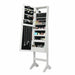 Material: MDF, Glass, Velvet Colour: White/ Black Overall Dimension: 35cm x 32cm x 145cm Battery Type: 3 x AA (not included) Product Weight: 10kg Package Include: 1 x Jewelry Cabinet 2 x Stand 1 x Accessories Bag 1 x Instruction