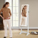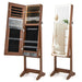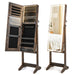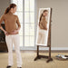 This freestanding mirrored jewelry armoire will make your life much easier! Equipped with 72 earring slots, 24 earring stud holes, 20 necklace hooks, 65 ring slots, 1 zippered plastic bag and 1 bracelet rod, this jewelry cabinet can organize all your jewelry properly. Plus, the lipstick tray, 2 shelves and 2 drawers that are all made from acrylic offer extra storage space for your makeup, skin care products, etc. To keep your belongings well protected, the jewelry armoire adopts a lockable door and soft velvet lining inside. More importantly, the touch screen full-length mirror with 3-color LED lighting can bring light to your room, while the built-in 3-color LED lights make it easier for you to choose the jewelry in the dark. Besides, there are 3 holes on each side of the stand, allowing you to adjust the tilt angle of the jewelry cabinet to get a better view. Large Capacity and Classified Storage: This jewelry cabinet comes with 72 earring slots and 24 earring stud holes, 1 zippered storage bag, 20 necklace hooks, 65 ring slots, 1 acrylic cosmetics and lipstick box, 1 bracelet rod, 2 removable acrylic storage shelves, 1 fixed storage shelf and 2 acrylic drawers to keep your jewelry organized and easily accessible. External and Internal LED Lights: The standing jewelry armoire features a lighted external full-screen mirror, which has 3 color temperature options: cool white, warm white, warm yellow. Plus, the built-in dimmable LED strip also has 3 colors of lights for you to choose: blue, blue and white mix, yellow. And you can long press the button to adjust the brightness. Note: please connect the included power adapter before using. Well-made and Thoughtful Design: Equipped with a lockable door with keys, the mirrored jewelry cabinet keeps every piece of your jewelry safe. Moreover, the back anti-tipping strap, reinforced base and anti-slip foot pads at the bottom ensure high stability and security. 2 in 1 Adjustable Jewelry Cabinet: This multipurpose freestanding jewelry cabinet & full-length mirror can perfectly meet all your dressing and jewelry storage needs. In addition, the jewelry armoire features 3 adjustable tilt angles, allowing you to find the most suitable angle for you. Perfect Gift for Your Beloved One: Combining elegant appearance and large storage capacity, this jewelry organizer armoire with LED lights is the ideal gift for your wife, mother or girlfriend. What's more, the cabinet body is pre-assembled for a hassle-free setup.