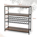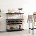 The table's chic rustic brown finish and mix of engineered wood and metal materials balance beauty and functionality, making it a versatile addition to any room. It offers a significant weight capacity, supporting up to 14 kg on each tier of the wine rack and up to 23 kg on each open shelf, ensuring that your space is not only stylish but also practical.