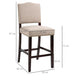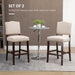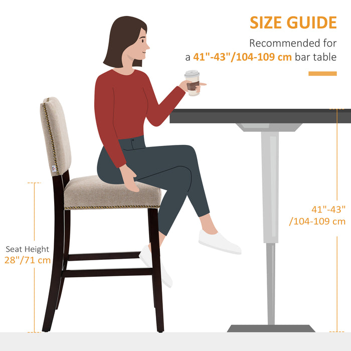The stools boast a refined beige with dark brown accents, enshrouded in a fabric with a soft, linen-like touch for an enhanced textural experience. These elements, along with the antique nailhead trim, contribute to the bar stool set's aesthetic, promoting an environment of elegance and comfort.
