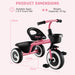 Colour: Blue/Pink/White Materials: PP, EVA, TPR, Carbon Steel Product Dimensions: 75 × 47 × 60 cm (L × W × H) Size of Seat: 22 × 19 cm (L × W) Seat Height: 36 cm Net Weight: 4.5 kg Weight Capacity: 25 kg Suitable Ages: 1.5-5 Years Old Box Qty: 1(May vary by batch) Package Includes: 1 × Toddler Tricycle 1 × Instruction Manual