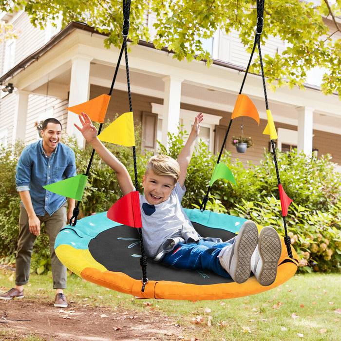 Watch as children's laughter fills the air with this swing that’s robust enough to hold two to three kids at once. Crafted with premium oxford fabric and PP material, you can count on a product that's both enduring and simple to clean. The vibrant multicolor design sparks joy and invites users of all ages to take a blissful break from the everyday.