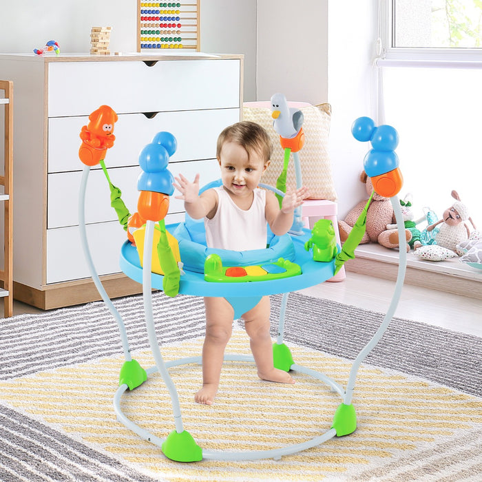 This Baby Jumper hosts a variety of 9 engaging toys designed to capture your baby’s attention and nurture their curiosity. Each toy can be moved to different positions or detached to be played with individually. One of the standout novelties is the amusing crocodile electronic piano. It boasts 2 music modes and can glow with radiant light while producing 20 appealing sound effects - an array of captivating experiences for your little one!