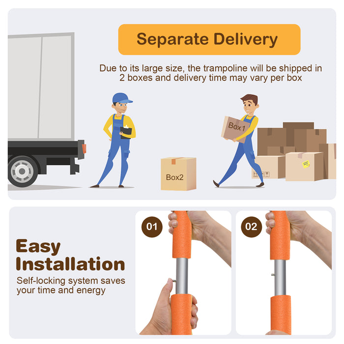 Our trampoline arrives with a clear set of instructions that make the assembly process absolutely straightforward. Thanks to an efficient self-locking system, you'll have it set up in no time. To ensure the completeness of your product, note that we ship in two separate packages and there might be a slight difference in delivery times.