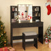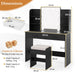The makeup table comes with a LED lighted mirror with 3 colors to light up your face even in low light conditions. Thanks to the light switch, you can also adjust the light color and brightness. Moreover, you will feel comfortable while sitting on the cushioned stool. The removable seat cushion features hook and loop fasteners as well as the smooth zipper. The table features 4 open shelves, 2 drawers, and 1 spacious tabletop to display or store a variety of sundries. You can charge your phone or other devices with the included charging station. Furthermore, the sturdy widened legs help the vanity set remain stable. The anti-slip foot pads enhance overall steadiness and protect the floor from getting scratched. Bullet Point: 3-color Lighted Vanity Mirror: The vanity table has a mirror with 10 light bulbs. There are 3 color settings (warm yellow/warm white/cool white) and adjustable brightness for you to choose. You can use the light switch to customize the lighting mode for different uses. Sufficient Storage Space: The makeup table is equipped with 4 open shelves, 1 spacious tabletop, and 2 storage drawers to store your jewelry, cosmetics, skin care products, hair dryers, and more. It will keep your dressing area neat and clean. Additional Charging Station: The extra charging station has 2 AC outlets (250V/13A) , a USB(12V/1.5A) and a Type-c ports (12V/1.67A), allowing you to freely charge your phones, beauty tools, or other devices. The power cord is 1.5 m long. Additionally, the cable management hole helps to organize your cables. Cushioned Sitting Stool: Featuring a soft seat cushion, the stool provides a comfy seating experience. Thanks to hook and loop fasteners, the seat cushion can be easily removed when not in use. The zippered cushion cover ensures easy cleaning. More Details of Vanity Table Set: The handy drawer handles and smooth metal slides make the drawers easy to open. Moreover, the widened legs and anti-slip foot pads keep the vanity table and chair steady and not easy to wobble.