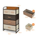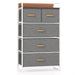 A multifunctional and nice-looking organizer unit for your home! This dresser storage tower with 4/5 foldable drawers will organize your items in good order to maximize your space and make your room tidy. High-grade fabric drawers can keep things in good condition and are more durable. The modern style allows the dresser to blend with any home decor easily. It is perfect for bedrooms, nursery rooms, laundry rooms, living rooms, hallways, closets, etc. As for the quality, the cabinet is made of sturdy steel frame and durable MDF top, ensuring strong stability and long-lasting use. And the wooden top is smooth and waterproof for easy cleaning. Featuring a lightweight and compact design, this 4-drawer dresser chest stand is portable, and easy to move and assemble. If you are looking for such a product, don't hesitate to place an order! Large Capacity and Premium Fabric: Equipped with 4/5 foldable and removable drawers of 2 different sizes, this dresser provides large space for you to store items by type, including clothes, toys, scarves, socks, etc. to make your room neat. Moreover, the drawers are made of high-quality fabric, which is breathable, non-toxic and durable. Sturdy Iron Frame and Wooden Top: Supported by a heavy-duty iron frame, this closet cabinet ensures great sturdiness without any wobbliness. The adjustable foot pads can protect the floor from scratches while enhancing stability. Besides, a spacious and waterproof wooden top provides a safe place for holding cups, plants, clocks, etc. Chic and Practical Home Organiser: This 4/5-drawer storage dresser combines utility function with an elegant look, which makes it an ideal addition to your home. And this drawer tower only takes up small space while providing plenty of storage space, which can work anywhere in your home, like bedroom, nursery room, living room, or entryway. Thoughtful Details and Easy to Move: Each drawer is equipped with a solid wood handle for opening and closing more easily. The anti-toppling device and anti-drop blocking plate provide added stability and safety. Moreover, thanks to the lightweight design and rounded handle, you can move the dresser conveniently anywhere. Easy to Maintain and Install: Thanks to the waterproof wooden top and washable fabric drawers, this chest of drawers is easy to clean with a damp cloth. According to the detailed installation manual included, you can easily finish the assembly of this storage unit.