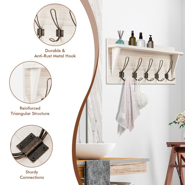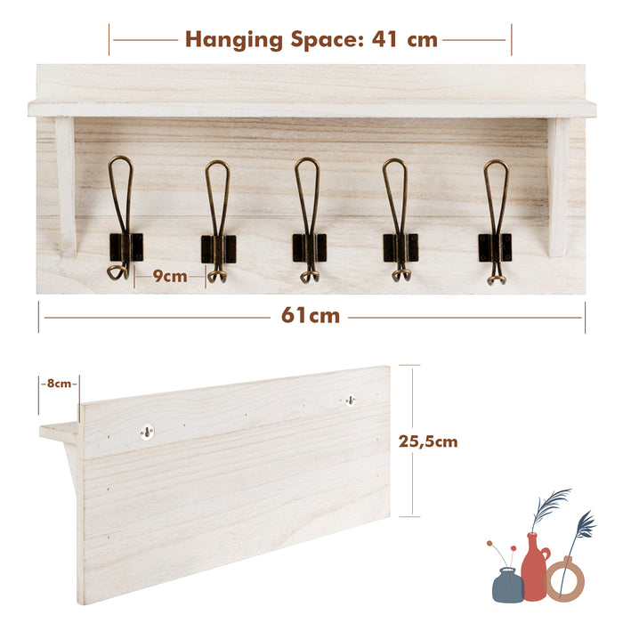 Boasting an array of five sturdy dual hooks, this coat rack simplifies your life by offering ample space for hanging an assortment of items like hats, coats, keys, and even your favorite scarves. The anxiety of misplaced keys when rushing out is now a thing of the past! In addition to its hanging prowess, the coat rack is equipped with an upper shelf designed for housing sundries - a handy spot for decorative accents, daily skincare products, or even spice bottles for those kitchen mountings.