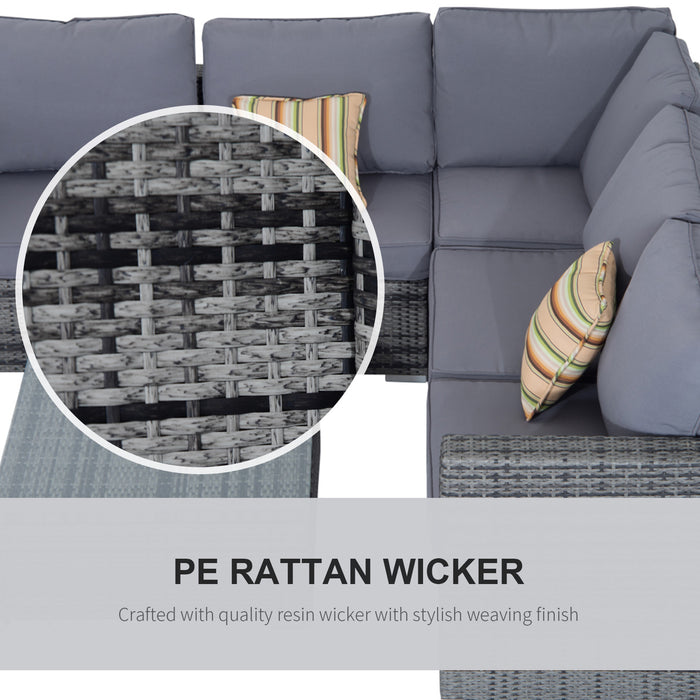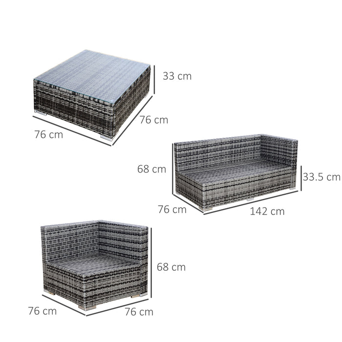 Finished in a tasteful grey hue, the set is comprised of materials selected for their longevity and visual appeal: steel, PE rattan, polyester fabric for the cushions, and tempered glass for the table. Furthermore, the sofa dimensions are elegantly proportionate, striking a balance between generous seating space and a neat, compact footprint.
