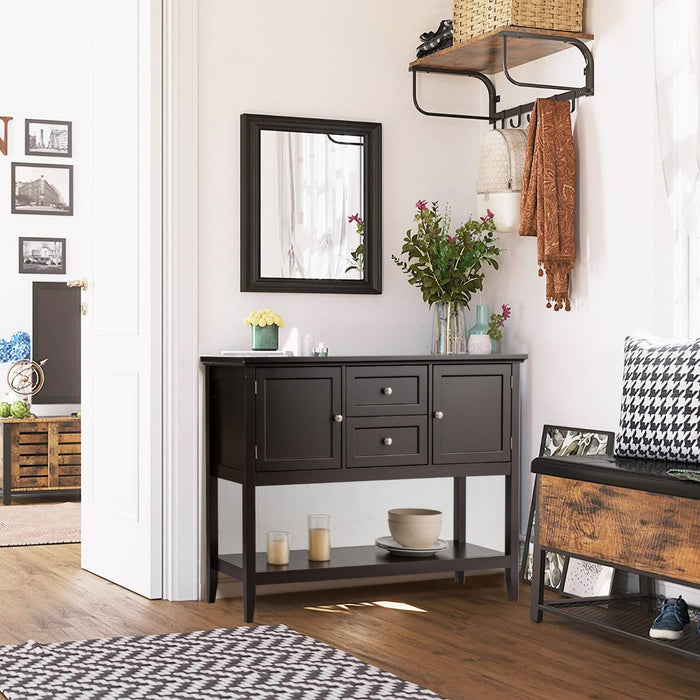 Are you still looking for a practical sofa table with high attractiveness? Our buffet sideboard will be the perfect choice. Polished surface and elegant style show an eye-catching looking, which is ideal for decorating all occasions. 2 cabinets and 2 drawers provide ample storage space with safe protection. Also, the spacious tabletop and bottom rack help to display collections in a better way. This narrow console table allows you to organized items orderly while saving space. Made of premium MDF and solid wood, this sofa table ensures high stability, durability and sturdiness. The table can load up to 125kg without wobbling. In a word, this modern buffet sideboard is a necessary addition to home, office and cafe store. Elegant and Versatile Console Sofa Table: This narrow console table can be placed in the entryway for storage and decoration. Thanks to its elegant wooden appearance, this sofa table can be perfectly matched with various decor styles, adding charming appeal to your room. Ample Storage Space for Better Displaying: 2 drawers and 2 cabinets provides you with ample space to store items in partition. The spacious tabletop and bottom large rack allow you to display collections in an outstanding place and store handy things for easy access. Durable Material and Sturdy Construction: Adopted premium MDF, this buffet sideboard ensures high durability and wear resistance. Thanks to the solid wood legs and sturdy construction, this sofa table can be supported stably and load up to 125kg. Wide Application in All Occasions: This stylish sofa table ensures attractiveness and practicality. You can treat it as a sideboard, a console table, an entry table and a buffet table. Also, the table can be used in different occasions, such as office, cafe store and restaurant. Quick Set-up and Easy Cleaning: Since all parts and accessories are given in the package, this console table can be put together quickly following the detailed instruction. In addition, the waterproof surface with smooth design can be cleaned easily with a damp cloth.