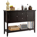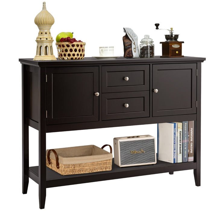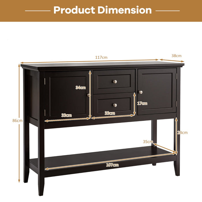 Colour: Brown Material: MDF + Pine Wood Product Dimensions: 117 x 38 x 86cm (L x W x H) Net Weight: 28kg Weight Capacity of Desktop: 50kg Weight Capacity of Each Drawer: 10kg Weight Capacity of Each Cabinet: 15kg Weight Capacity of Bottom Shelf: 25kg Box QTY: 1(May vary by batch) Package Includes: 1 x Buffet Sideboard 1 x Instruction Manual