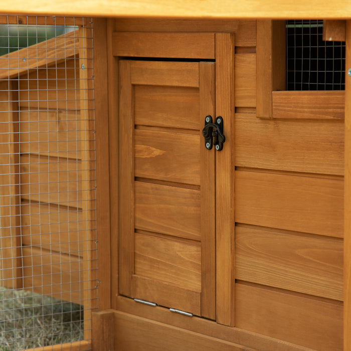 Crafted with a commitment to durability, our chicken coop is constructed with solid fir wood. Its natural warmth provides a safe haven for your chickens, while the weather-proof asphalt tilt roof ensures your feathered friends stay dry and shaded, regardless of the weather conditions.