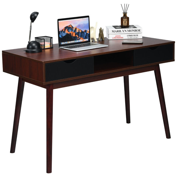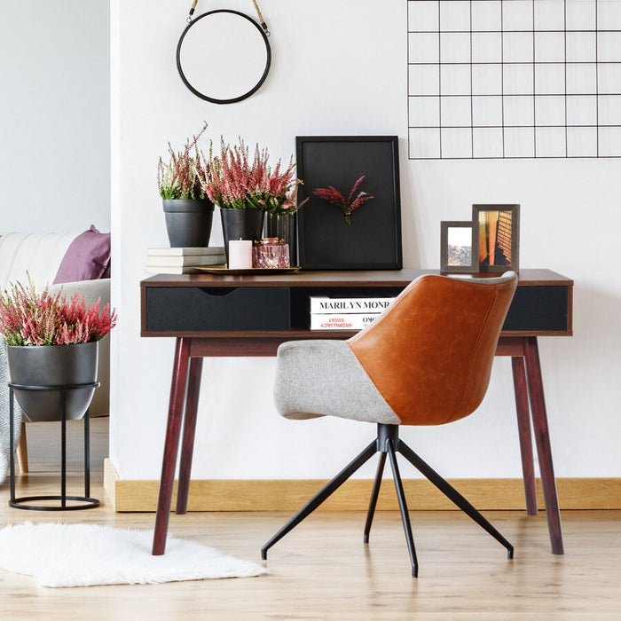 The sprawl of its 120x55cm desktop invites a clutter-free environment for multiple monitors, laptops, and other essentials. Task lighting and decorative elements sit comfortably alongside your tech, creating an inviting and productive space. Further enhancing its utility, the desk is outfitted with two smoothly sliding drawers and an open shelf arrangement to neatly tuck away your supplies, documents, and gadgets—all while keeping them readily accessible.