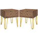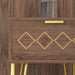 The stunning, subtle wood effect is tastefully paired with luxurious gold accents, presenting an exceptional statement piece. The drawer, adorned with a diamond-shaped pattern and displaying a gorgeous gold-toned handle, opens to provide ample space for personal effects. The distinctive hairpin-style metal legs not only add a sense of stability but also enhance the table's visual intrigue with their golden luster.