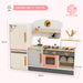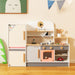 It features a range hood, side refrigerator, faucet & sink, stovetop and BBQ grill for kids to pretend to be a real chef and enjoy the cooking game. By rotating the knobs, kids will hear the realistic sound. What’s more, 14 kitchen accessories add more fun. The kids play kitchen with round corners is BPA-free, harmless and safe to use. Thus, it will accompany your little one(over 3 years old) for a long time. Interactive Kids Play Kitchen: The play kitchen includes an upper range hood, side refrigerator, faucet and sink, realistic stovetop and BBQ grill for an immersive playing environment. Moreover, there are 3 rotary “clicking” knobs and 1 cute clock with turnable pointers to promote kid’s fine motor skills. Abundant Tools and Accessories: It also comes with 1 pan, 1 pot with lid, 1 cup, 1 meat, 1 shrimp, 1 mushroom, 1 green pepper, 1 knife, 1 flat spatula, 1 slotted spatula, 2 condiments, 2 x dishes and 2 barbecue poles. Thus, this toy kitchen gives kids a more realistic feel and is great for kid’s imagination and creativity. Classified Space for Storage: This kitchen playset is also equipped with multiple storage space, such as the top shelf, side open shelf, dish rack, roaster and storage cabinet. Thanks to these storage areas, kids can learn how to organize the kitchen utensils and keep the room tidy. Safe and Reliable Construction: Made of premium solid wood and MDF materials, the kitchen toy set is strong and durable enough to withstand daily use for years. Meanwhile, the round corners protect kids from scratching. Perfect Gift for Your Toddlers: The wooden play kitchen is specially designed for kids over 3, which is an ideal gift choice for their birthdays or other festivals. Supported by stable legs, it stays steady on the ground. Also, magnetic catch, handy handles and flexible hinges allow toddlers to easily open and close all doors.