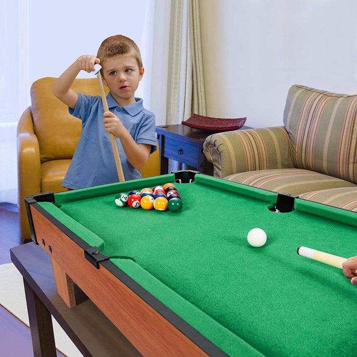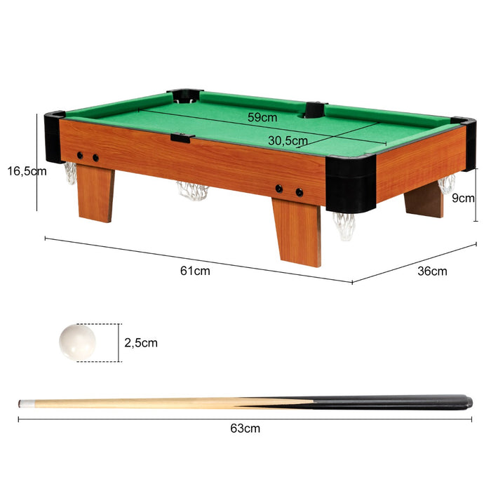 The pool table boasts a sleek woodgrain finish, elevating the look of any room while promising endless entertainment. Despite its compact size, every corner and crevice of this table mirrors the allure of a full-sized billiards experience. Built with premium materials, the sturdy construction ensures both stability and long-lasting durability for continuous play.