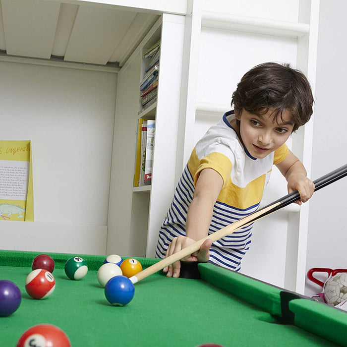 Covered with a green tricot fabric, the playing surface imitates the feel of an authentic pool hall, providing a smooth and even roll for every shot. The realistic playing experience is ideal for sharpening skills or simply enjoying a casual game with friends and family.