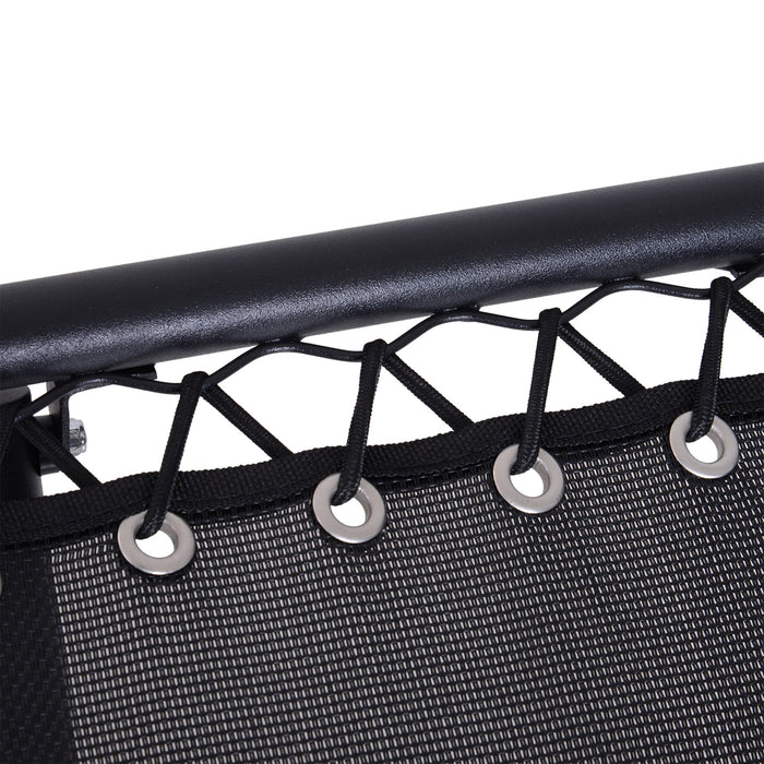 Boasting a striking black aesthetic, the loungers are crafted with a durable steel frame while the breathable mesh fabric provides a cool and comfortable seating surface. The harmonizing table stands as a testament to the set's solid craftsmanship.
